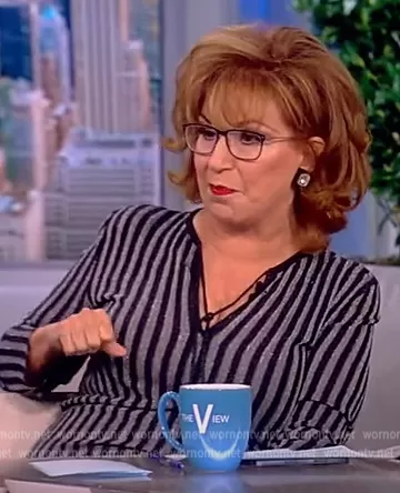Joy Behar on The View on ABC was spotted wearing this striped tie neck sweater on The View on Nov 15 2022's episode. Joy's Sweater is the Ribbed Metallic Stripe Sweater by Stella McCartney.