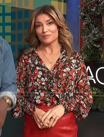 Kit Hoover on Access Hollywood on NBC was spotted wearing this black floral ruffle top on Access Hollywood on Nov 14 2022's episode. Kit's Top is the Misa Long Sleeve Ruffle Top by T Tahari.