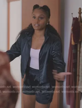 Simone (played by Geffri Hightower) on All American Homecoming on CWTV was spotted wearing this black cropped jacket on All American Homecoming on episode 'No More Drama' (2x05) in Nov 2022. Simone's Jacket is the Utility Sport Zip-Up Crop Jacket by Skims . Simone's Shorts is the Utility Sport Shorts by Skims.