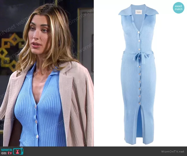 Sloan Peterson (played by Jessica Serfaty) on Days of our Lives on Peacock was spotted wearing this blue ribbed dress on Days of our Lives on Nov 16 2022's episode. Sloan's Dress is the Sleeveless Ribbed-Knit Dress by Nanushka.