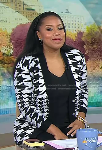 Sheinelle Jones on Today on NBC was spotted wearing this houndstooth cardigan and earrings on Today on Nov 16 2022's episode. Sheinelle's Sweater is the Houndstooth Jacquard Cardigan by Talbots . Sheinelle's Earrings is the 14K Goldplated & Baroque Pearl Earrings by Kendra Scott.