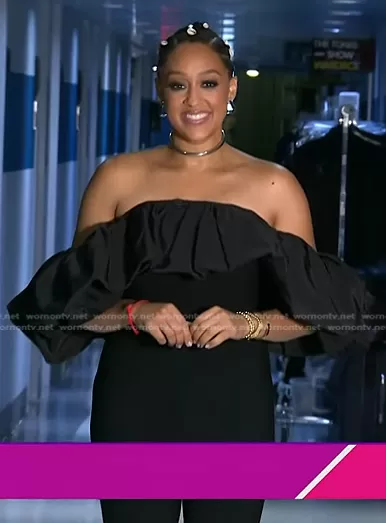 on Today on NBC was spotted wearing this black ruffled off-shoulder jumpsuit on Today on Nov 16 2022's episode. 's Jumpsuit is the Strapless Drape Skinny-Leg Jumpsuit by Oscar de la Renta.