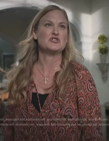 (played by ) on Manifest on NBC was spotted wearing this Coral printed tie neck blouse on Manifest on episode 'Romeo' (4x07) in Nov 2022. 's Top is the Bryce Silk Blouse by A.L.C..