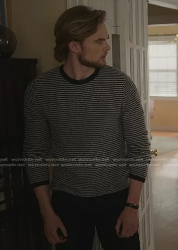 TJ Morrison (played by Garrett Wareing) on Manifest on NBC was spotted wearing this black striped sweater on Manifest on episode 'Inversion Illusion' (4x10) in Nov 2022. 's Sweater is the Plush Stripe Crew Neck Sweater by Vince.