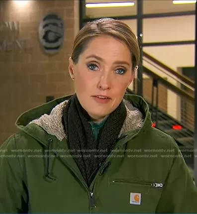 on Good Morning America on ABC was spotted wearing this green hooded jacket on Good Morning America on Nov 17 2022's episode. 's Jacket is the OJ141 Sherpa Lined Hooded Jacket in Basil by Carhartt.
