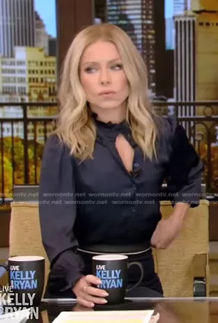 Kelly Ripa on Live with Kelly and Mark on Disney ABC Home Entertainment was spotted wearing this navy ruffle blouse and pencil skirt on Live with Kelly and Ryan on Nov 17 2022's episode. Kelly's Top is the Tacca Satin Ruffle Button-Up Blouse by Zadig & Voltaire . Kelly's Skirt is the Arreton Skirt by Roland Mouret.