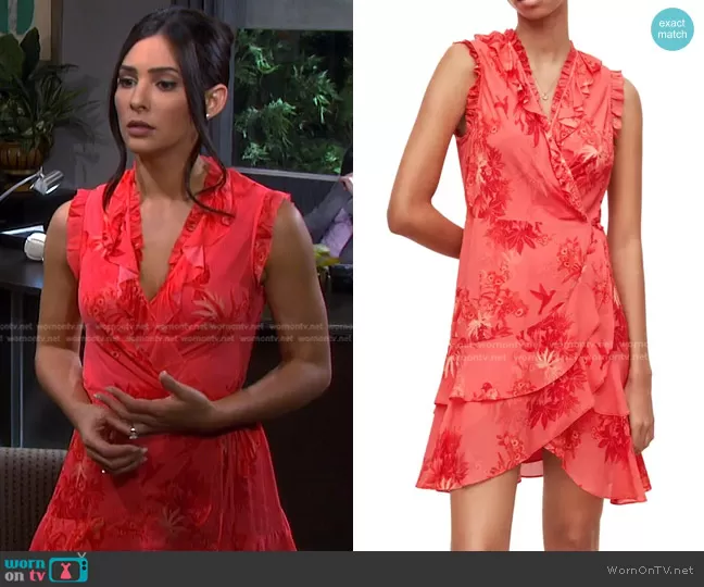 Gabi Hernandez (played by Camila Banus) on Days of our Lives on Peacock was spotted wearing this pink floral ruffle trim dress on Days of our Lives on Nov 18 2022's episode. Gabi (old)'s Dress is the Ari Floral Print Wrap Dress by All Saints.