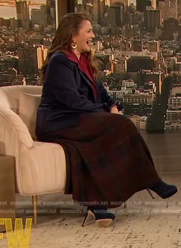 Drew Barrymore on The Drew Barrymore Show on CBS was spotted wearing this plaid skirt on The Drew Barrymore Show on Dec 12 2022's episode. Drew's Skirt is the Erika Skirt by Ralph Lauren.