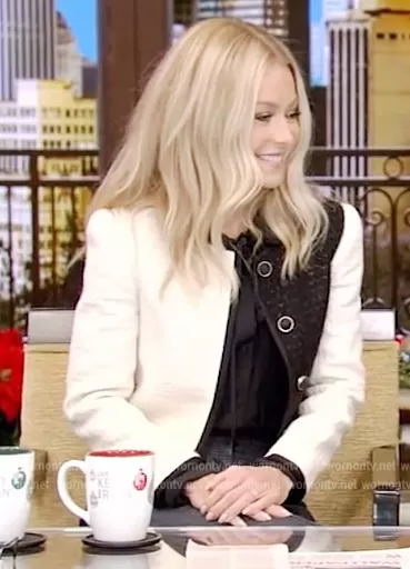 Kelly Ripa on Live with Kelly and Mark on Disney ABC Home Entertainment was spotted wearing this colorblock tweed jacket on Live with Kelly and Ryan on Dec 28 2022's episode. Kelly's Jacket is the Two-Tone Tweed Jacket by Saint Laurent.