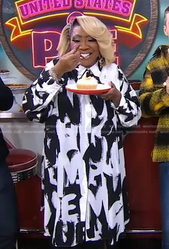 on Good Morning America on ABC was spotted wearing this grafitti print shirt on Good Morning America on Nov 18 2022's episode. 's Dress is the Grafitti Print Silk Long-Sleeve Shirtdress by Alexander McQueen.