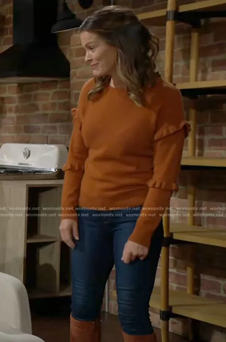 Chelsea Lawson (played by Melissa Claire Egan) on The Young and the Restless on CBS was spotted wearing this orange ruffle sleeve sweater on The Young and the Restless on Nov 18 2022's episode. Chelsea's Sweater is the Josephine Ruffle Top by 27 Miles Malibu.