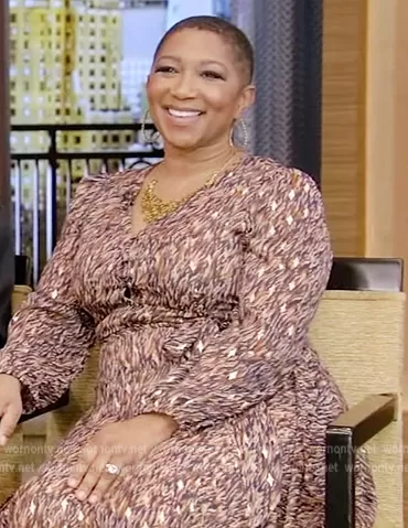 Deja Vu on Live with Kelly and Mark on Disney ABC Home Entertainment was spotted wearing this printed tie waist dress on Live with Kelly and Ryan on Oct 16 2023's episode. Deja Vu's Dress is the Long Sleeve V Neck Maxi Dress by Vince Camuto.