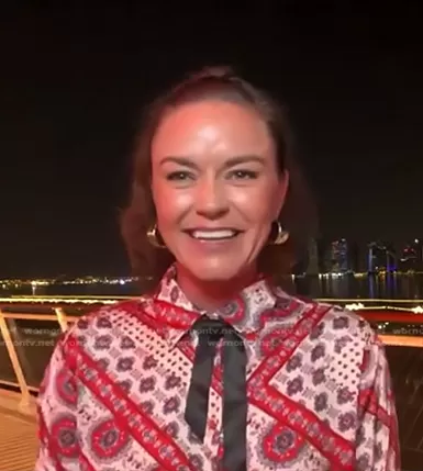 on Access Hollywood on NBC was spotted wearing this white printed blouse on Access Hollywood on Nov 18 2022's episode. 's Top is the Patchwork Print Satin Shirt by Zara.