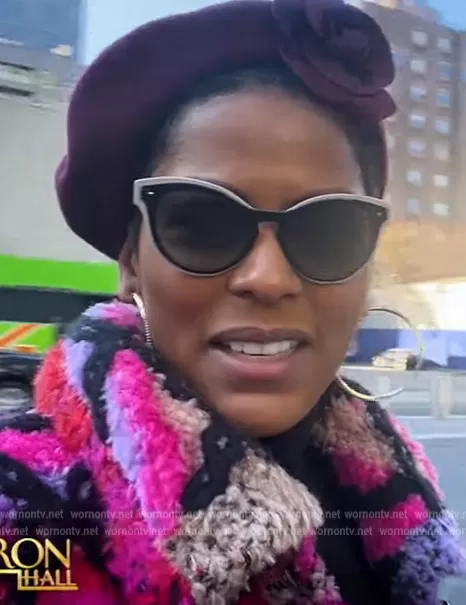 Tamron Hall on Tamron Hall Show on ABC was spotted wearing this black sunglasses on Tamron Hall Show on Nov 21 2022's episode. Tamron's Sunglasses is the 4017 Sunglasses by Valentino.