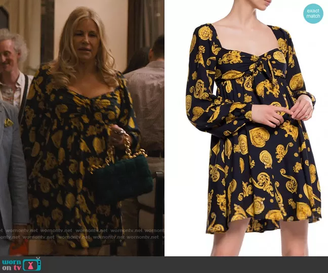 Tanya McQuoid (played by Jennifer Coolidge) on The White Lotus on HBO was spotted wearing this black and yellow printed mini dress on The White Lotus on episode 'In the Sandbox' (2x04) in Nov 2022. Tanya's Dress is the Dress with denuded shoulders by Versace Jeans Couture . Tanya's Bag is the Chain Cassette Suede Crossbody Bag in Emerald Green by Bottega Veneta.