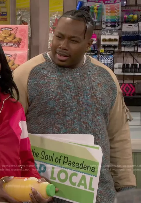 Marty (played by Marcel Spears) on The Neighborhood on CBS was spotted wearing this cable knit sweater with contrasting sleeves on The Neighborhood on episode 'Welcome to What Used to be the Neighborhood' (5x08) in Nov 2022. Marty's Sweater is the Nicholas Sweater in Driftwood by A Tiziano.