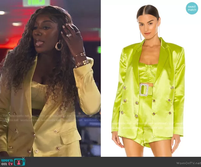 Wendy Osefo on The Real Housewives of Potomac on Bravo was spotted wearing this lime satin blazer and top on The Real Housewives of Potomac on episode 'Beef is Served' (7x07) in Nov 2022. Wendy's Top is the Capri Bralette Top by Bronx and Banco . Wendy's Blazer is the Capri Blazer by Bronx and Banco . Wendy's Bag is the DG Girls Metallic Crossbody Bag by Dolce & Gabbana.
