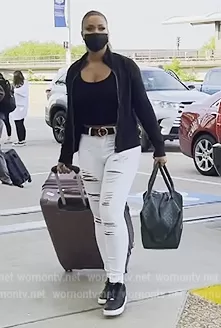Gizelle Bryant on The Real Housewives of Potomac on Bravo was spotted wearing this white distressed jeans on The Real Housewives of Potomac on episode 'Burnin' and Beefin'' (7x06) in Nov 2022. Gizelle's Pants is the Slant Pocket Ripped Skinny Jeans by Shein.
