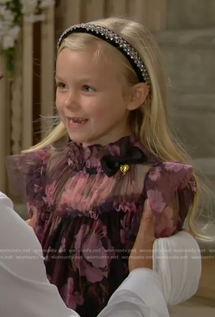 Kelly Spencer (played by Sophia Paras McKinlay) on The Bold and the Beautiful on CBS was spotted wearing this floral dress with bow tie on The Bold and the Beautiful on Nov 22 2022's episode. 's Dress is the Myrtle Kew Ruffle Dress in Black by Angels Face .