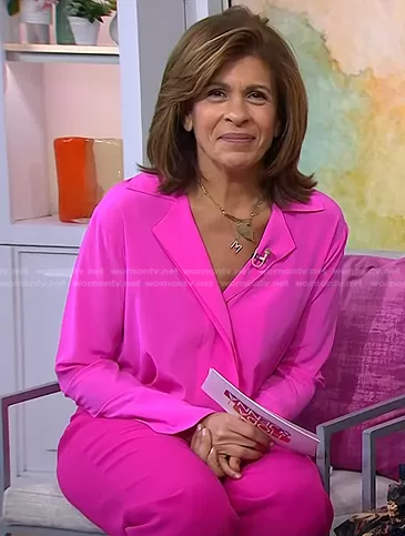 Hoda Kotb on Today on NBC was spotted wearing this pink notch collar blouse on Today on Aug 19 2024's episode. Hoda's Top is the Kinsley Stretch Silk Blouse by A.L.C..