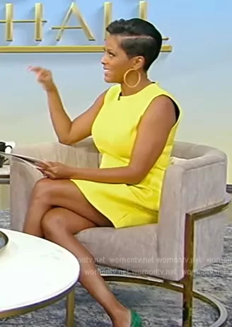Tamron Hall on Tamron Hall Show on ABC was spotted wearing this yellow sleeveless mini dress on Tamron Hall Show on Nov 22 2022's episode. Tamron's Dress is the Wool-ponte mini dress by Dolce & Gabbana.