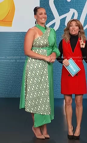on Access Hollywood on NBC was spotted wearing this green geometric asymmetric dress on Access Hollywood on Nov 22 2022's episode. 's Dress is the Geo Print One Shoulder Asymmetrical Dress by Shein.