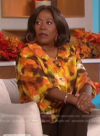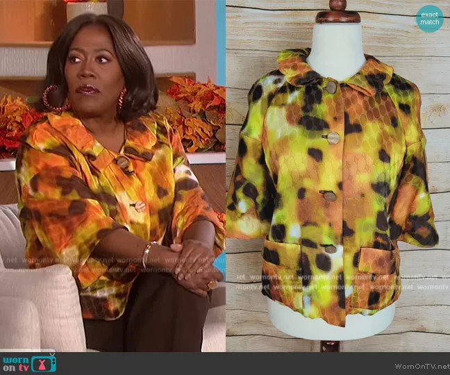 Sheryl Underwood on The Talk on CBS was spotted wearing this tie dye print jacket on The Talk on Nov 22 2022's episode. Sheryl's Jacket is the Tie Dye Ruffle Collar Jacket by St. John.