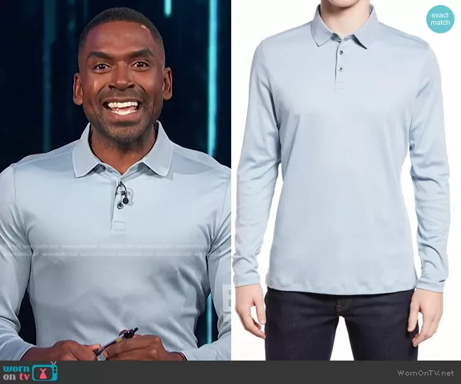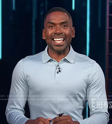 Justin Sylvester on E! News on E! was spotted wearing this blue long sleeve polo shirt on E! News on Nov 23 2022's episode. Justin's Shirt is the Georgia Long Sleeve Polo in Pale Blue by Robert Barakett.
