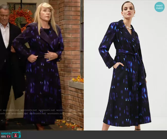 Nikki Reed Newman (played by Melody Thomas-Scott) on The Young and the Restless on CBS was spotted wearing this long blue printed coat on The Young and the Restless on Nov 23 2022's episode. Nikki's Coat is the Relentless Satin Back Crepe Woven Trench by Karen Millen.