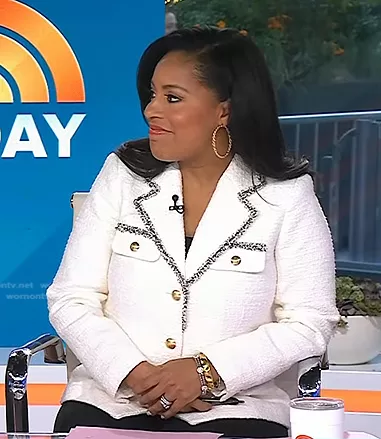 Sheinelle Jones on Today on NBC was spotted wearing this white contrast trim tweed blazer on Today on Nov 24 2022's episode. Sheinelle's Jacket is the Tweed Jacket by Talbots.
