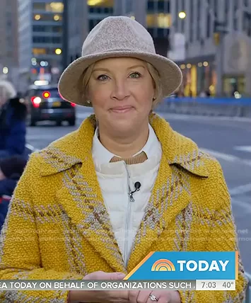 on Today on NBC was spotted wearing this yellow plaid coat on Today on Dec 08 2022's episode. 's Coat is the Kristen Dahlgren by Waverly Grey.