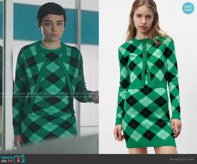Ari Blanco (played by Carla Diaz) on Elite on Netflix was spotted wearing this green argyle dress and cardigan on Elite on episode 'Separation' (6x08) in Nov 2022. Ari's Dress is the Diamond Pattern Knit Dress by Zara . Ari's Sweater is the Argyle Knit Cardigan by Zara.