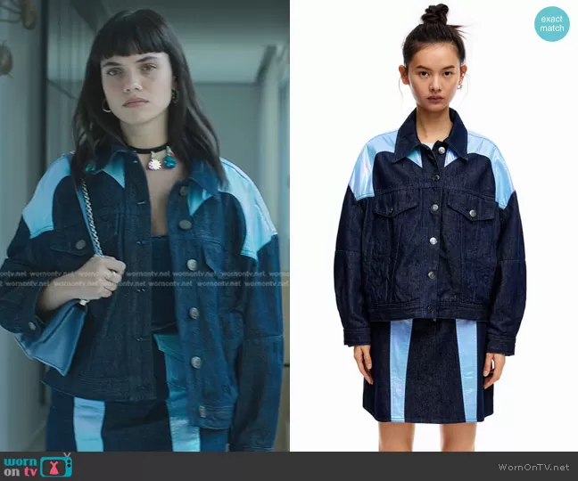 Mencia Blanco (played by Martina Cariddi) on Elite on Netflix was spotted wearing this blue colorblock denim jacket and skirt on Elite on episode 'Separation' (6x08) in Nov 2022. Mencia's Jacket is the Iridescent Denim Jacket by Bimba Y Lola . Mencia's Skirt is the Iridescent Denim Miniskirt by Bimba Y Lola.