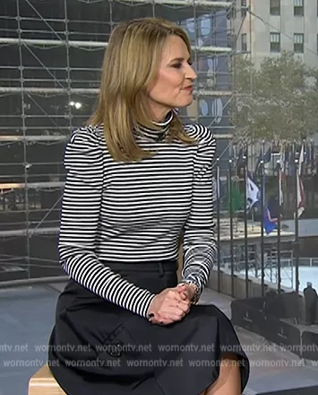 on E! News on E! was spotted wearing this stripe turtleneck top on E! News on Nov 25 2022's episode. 's Top is the Cedar Stripe Puff Sleeve Turtleneck Rib Top by Veronica Beard . 's Skirt is the Nylon Gabardine Skirt by Prada.