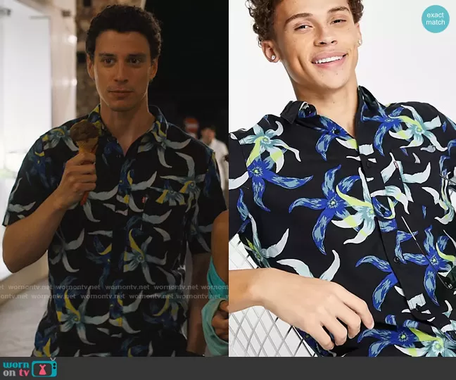 Albie Di Grasso (played by Adam DiMarco) on The White Lotus on HBO was spotted wearing this black floral shirt on The White Lotus on episode 'That's Amore' (2x05) in Nov 2022. Albie's Shirt is the Sunset Pocket Shirt in Black Leaf Print by Levis.