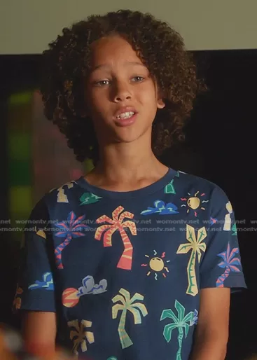 Denny (played by Declan Pratt) on 9-1-1 on Fox was spotted wearing this blue palm tree print tee on 9-1-1 on episode 'Red Flag' (6x09) in Nov 2022. 's Shirt is the Printed T-Shirt by H&M.