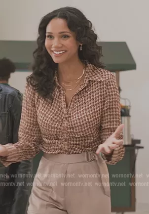 (played by Greta Onieogou) on All American Homecoming on CWTV was spotted wearing this printed ruched blouse on All American Homecoming on episode 'Integrity' (2x07) in Nov 2022. 's Top is the Ruched Button-Up Shirt by Astr the Label.