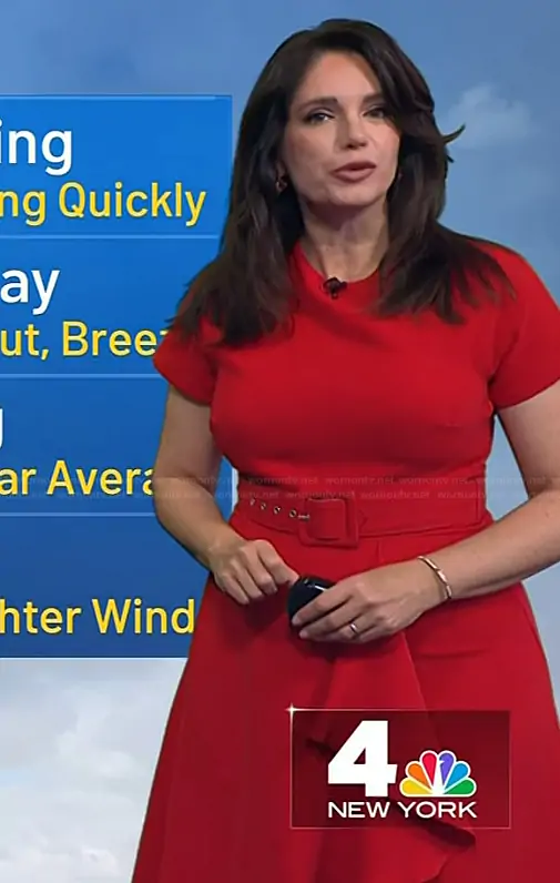 Maria Larosa on Today on NBC was spotted wearing this red belted flare dress on Today on Oct 22 2025's episode. Maria L's Dress is the Cascade Fit & Flare Dress by Maggy London.