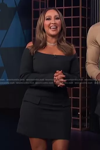 Adrienne Houghton on E! News on E! was spotted wearing this black off-shoulder mini dress on E! News on Nov 29 2022's episode. Adrienne's Dress is the Off-The-Shoulder Dress by Zara . Adrienne's Shoes is the Logo Satin Platform Ankle-Strap Sandals by Prada.