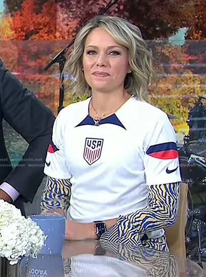 Dylan Dreyer on Today on NBC was spotted wearing this white USA tee on Today on Nov 30 2022's episode. Dylan's Top is the Nike Dri-FIT Soccer Jersey USMNT by Nike.