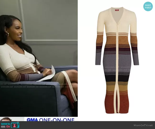 on Good Morning America on ABC was spotted wearing this striped ribbed dress on Good Morning America on Nov 30 2022's episode. 's Dress is the Shoko Sweater Dress in Sahara Stripe by Staud.