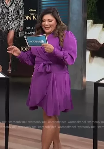 on Access Hollywood on NBC was spotted wearing this purple wrap dress on Access Hollywood on Nov 30 2022's episode. 's Dress is the Phoebe Wrap Ruffle Mini Dress by Alexia Admor.