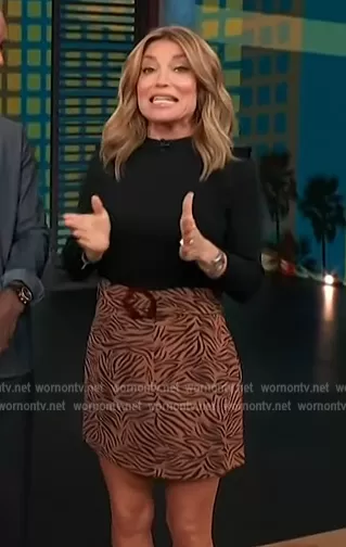 Kit Hoover on Access Hollywood on NBC was spotted wearing this brown tiger print mini skirt on Access Hollywood on Dec 12 2022's episode. Kit's Skirt is the Tiger Print Mini Skirt by Zara.