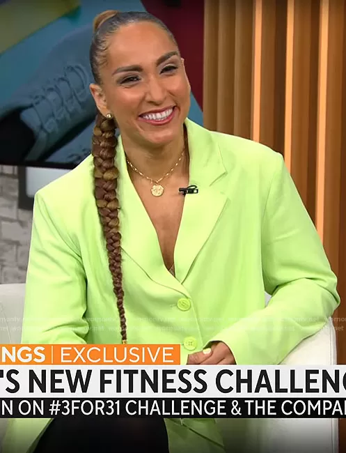 on CBS Mornings on CBS was spotted wearing this lime green cropped jacket and skirt set on CBS Mornings on Dec 01 2022's episode. 's Jacket is the Cropped Blazer in Sharp Green by We Wore What . 's Skirt is the Blazer Skirt in Sharp Green by We Wore What.
