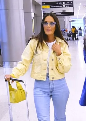 Lisa Barlow on The Real Housewives of Salt Lake City on Bravo was spotted wearing this yellow denim jacket on The Real Housewives of Salt Lake City on episode 'Not a Yacht of Fun' (3x09) in Dec 2022. Lisa's Jacket is the Bleached Organic Denim Jacket by Ganni . Lisa's Bag is the Mini Double Knot Leather Bag in Yellow by Bottega Veneta . Lisa's Sunglasses is the Cat-Eye Metal Sunglasses by Gucci.