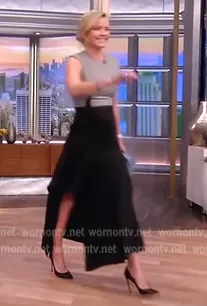 Sara Haines on The View on ABC was spotted wearing this two-tone dress on The View on Nov 24 2022's episode. Sara's Dress is the Donegal Drape Midi Dress by Alexander McQueen.