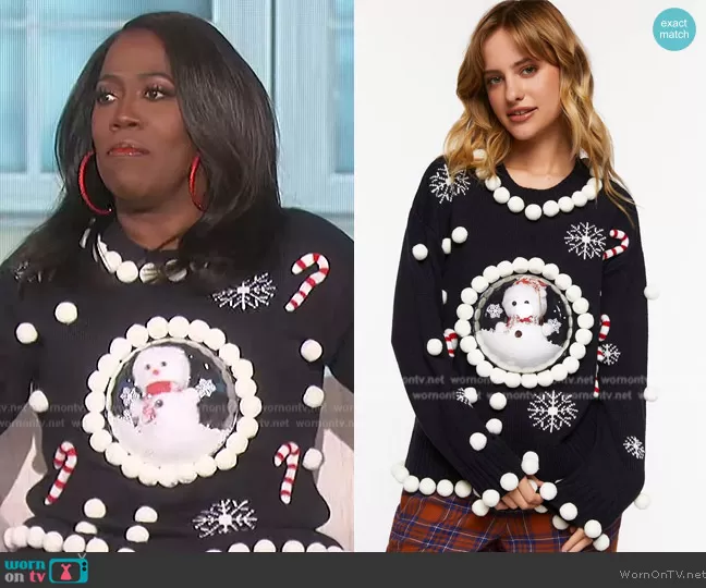 Sheryl Underwood on The Talk on CBS was spotted wearing this Snowman globe Christmas sweater on The Talk on Dec 01 2022's episode. Sheryl's Sweater is the Snow Globe Christmas Sweater by Forever 21.