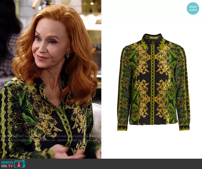 Sheila (played by Swoosie Kurtz) on Call Me Kat on Fox was spotted wearing this black and green printed blouse on Call Me Kat on episode 'Call Me Fancy Puffenstuff' (3x08) in Dec 2022. Sheila's Top is the Willa Shirt in Rendezvous by Alice + Olivia.