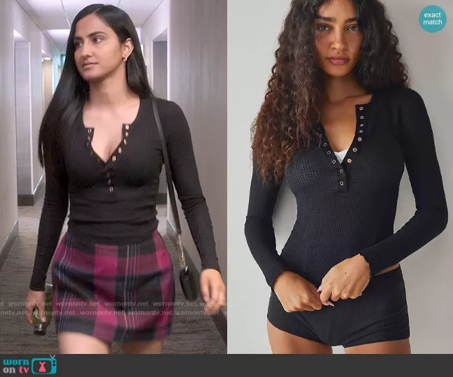 Bela Malhotra (played by Amrit Kaur) on The Sex Lives of College Girls on HBO was spotted wearing this black henley top and pink plaid skirt on The Sex Lives of College Girls on episode 'Doppelbanger' (2x06) in Dec 2022. Bela's Top is the One Of The Girls Henley in Black by Free People.