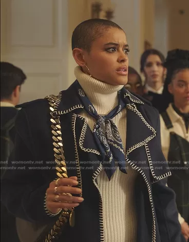 Julien Calloway (played by Jordan Alexander) on Gossip Girl on HBO Max was spotted wearing this navy stitched coat and bag on Gossip Girl on episode 'Guess Who's Coming at Dinner' (2x02) in Dec 2022. Julien's Coat is the Roman Oversized Whipstitched Felt Trench Coat by Khaite . Julien's Bag is the Frayme Bag in dark purple by Stella McCartney.